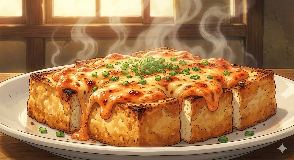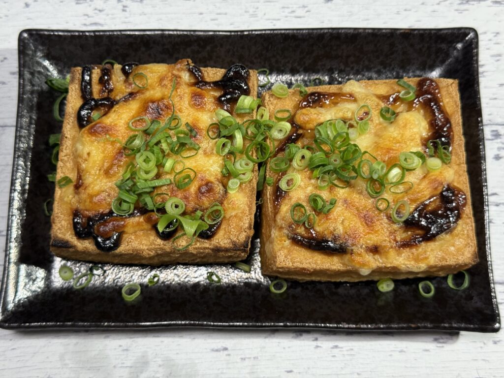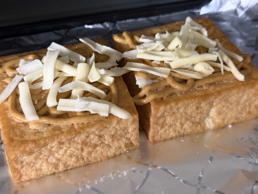 厚揚げが、マヨネーズというドレスを着て、トースターという舞台で踊っているみたい……。