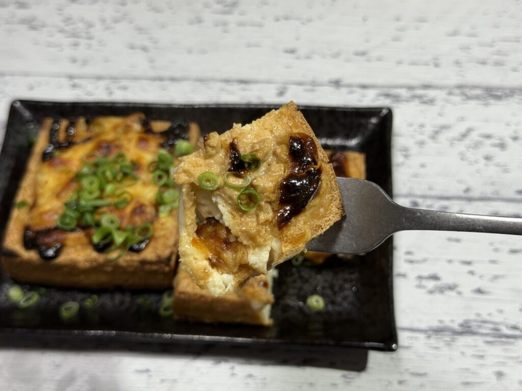 香ばしい音と共に、厚揚げが口の中へ消えていく。