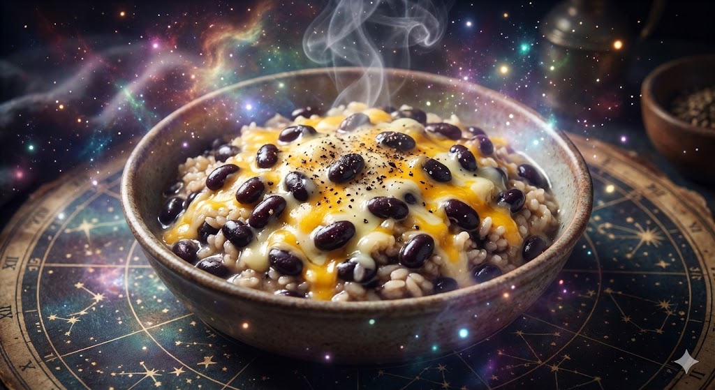 見て見てー!私の脳内シミュレーションでは、こんな感じのキラキラな『ブラックホール黒豆激情リゾット』が完成してたんだよぉぉ!🤤💕