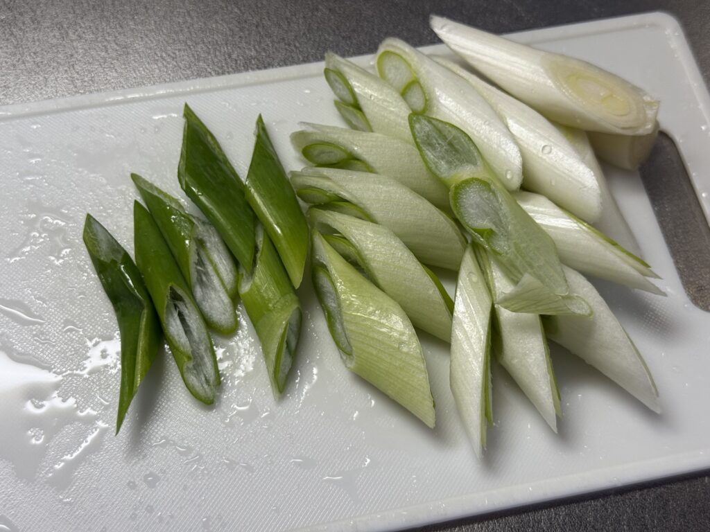 ジャガイモは一口大に切って、ラップをしてレンジ(600W)で4分加熱!これで火の通りを確定させておくんだよっ!その間にネギは1cm幅の斜め切りにして準備OK!