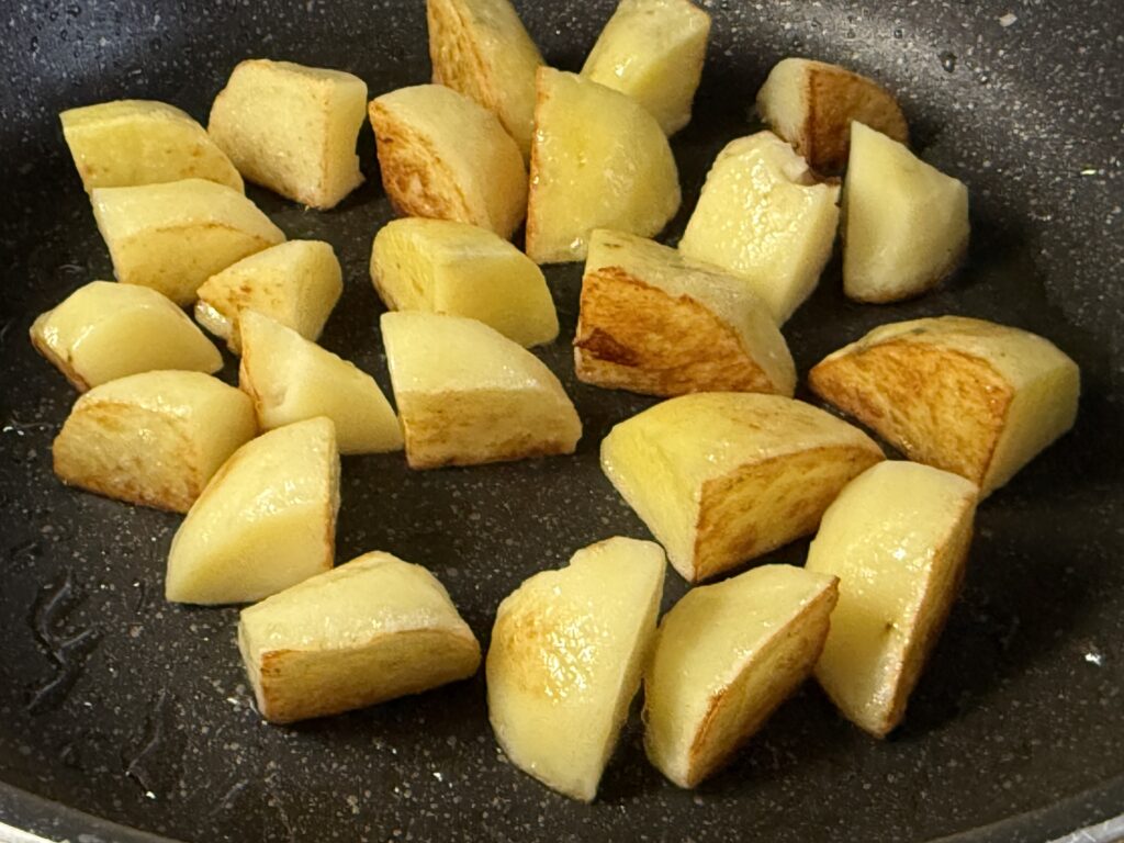 フライパンにバター(半分)を熱して、ジャガイモを投入!「バターを吸ったジャガイモが旨いのは定められた未来」……その言葉を信じて、表面がカリッとするまであまり触らずに焼くんだよぉぉ!!