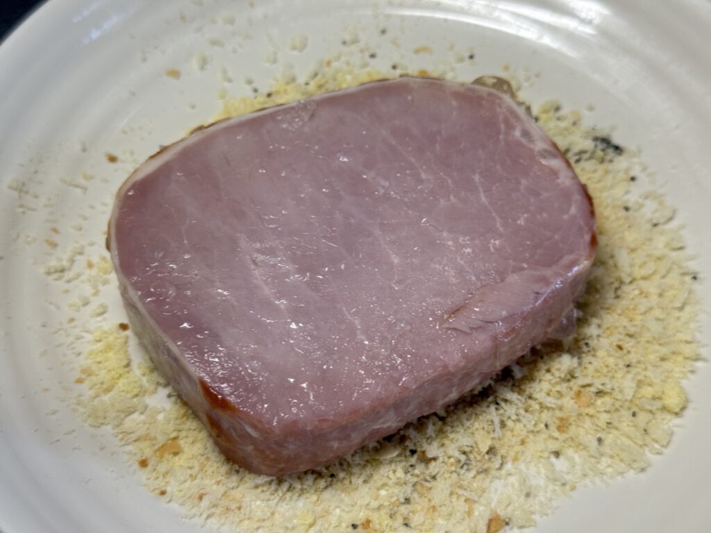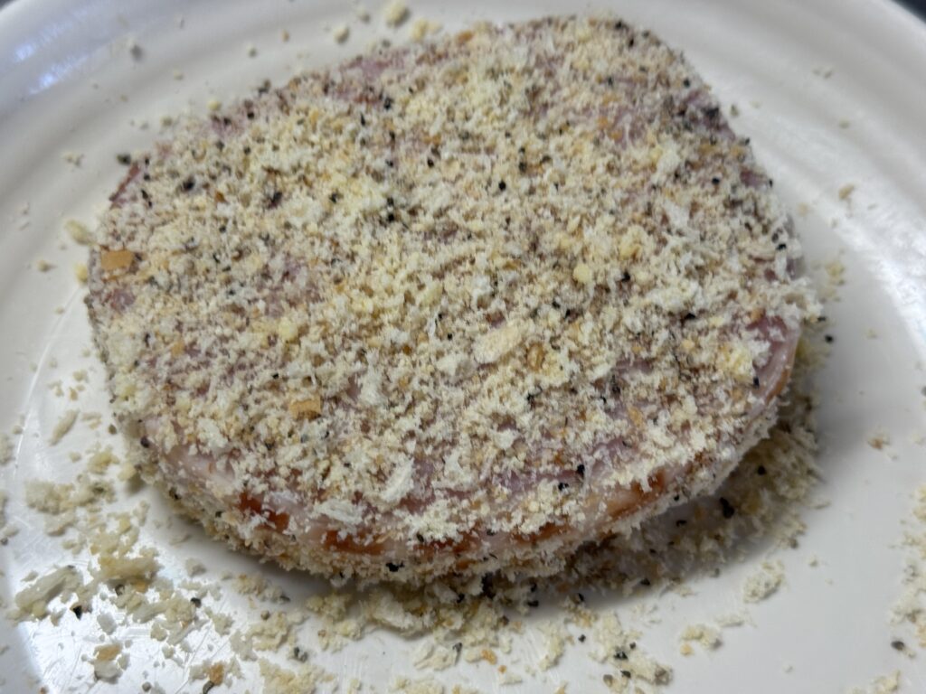 お皿にパン粉、粉チーズ、黒胡椒を混ぜ合わせるんだよ。そこにハムを置いて、手のひらで「美味しくなれ〜!」って念じながらギュッギュッ!と押し付けるの! 裏返して両面にしっかり衣をまとわせてねっ!