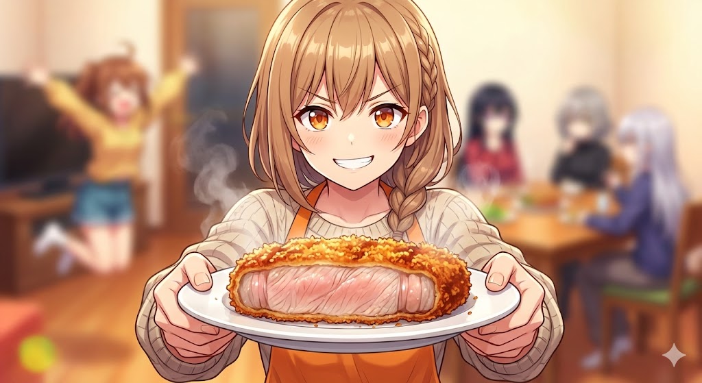 見て見てー!私の脳内シミュレーションでは、こんな感じのキラキラな『黄金チーズ衣の魔導ハムカツ・ステーキ』』が完成してたんだよぉぉ!🤤💕
