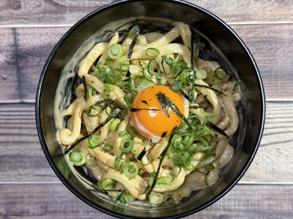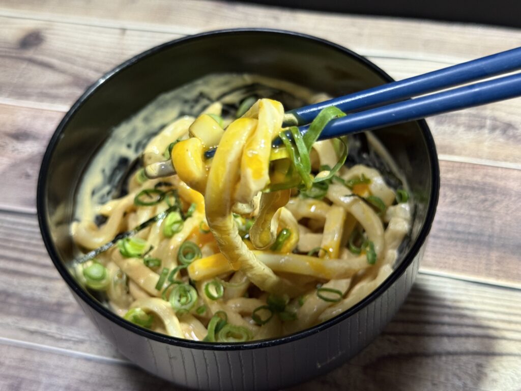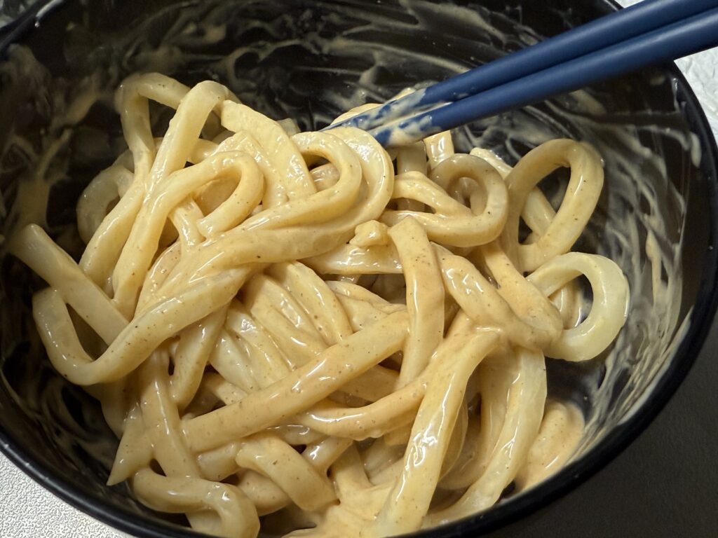 冷凍うどんのコシに、濃厚でビリビリくる特製マヨソースが絡みついて……。