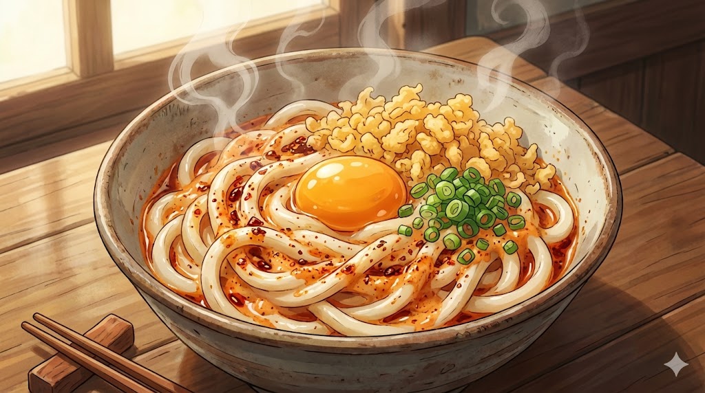 うどんの熱でマヨネーズが少し溶けて、酸味とスパイスの香りが部屋中に爆発(エクスプロージョン)するから気をつけてっ!
