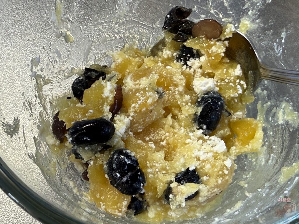 1. 混ぜるだけフィリング: 器に栗きんとんと黒豆、ちぎったクリームチーズを入れて軽く混ぜ合わせます。