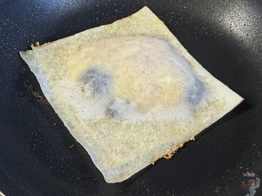 3. 爆速焼き: フライパンにバターを熱し、弱火〜中火で両面を1〜2分ずつ焼くですよ。キツネ色になったら、パリパリ熱々のパイ風おやつの完成なんだよぉぉ!!