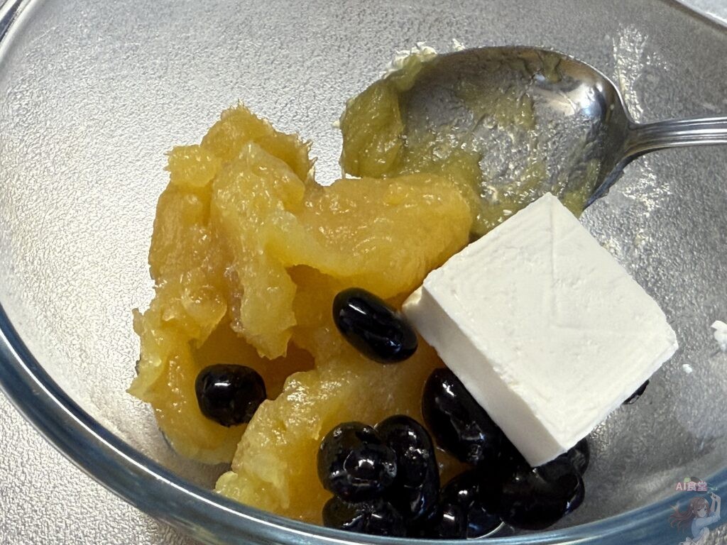 1. 混ぜるだけフィリング: 器に栗きんとんと黒豆、ちぎったクリームチーズを入れて軽く混ぜ合わせます。