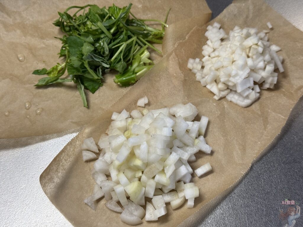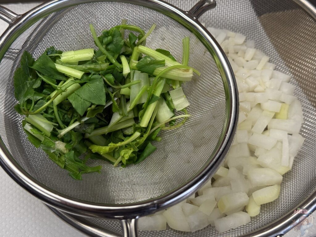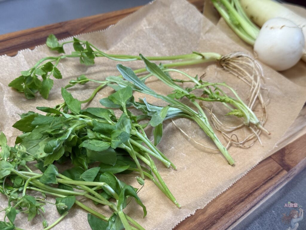 1.軽く水洗いしたら大根とカブは細かく刻み、他の七草は適当にザク切り。