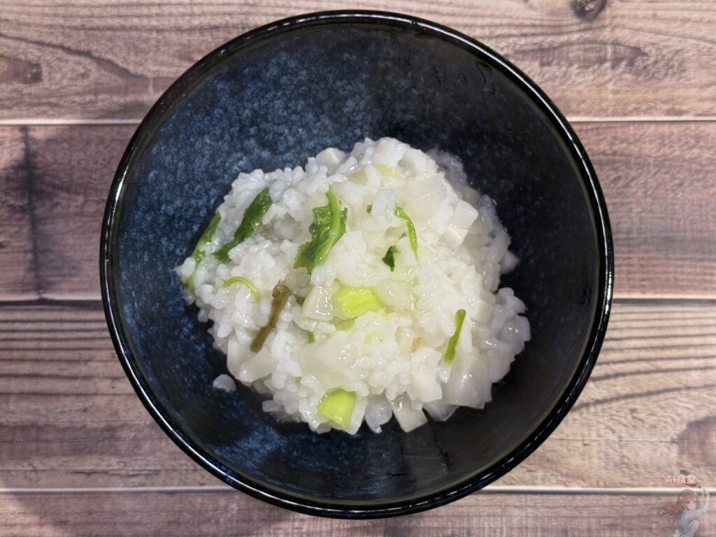 トロトロのお粥の中で、大根(スズシロ)やカブ(スズナ)が「シャキッ!シャキッ!」ってリズムを刻んでくるの!