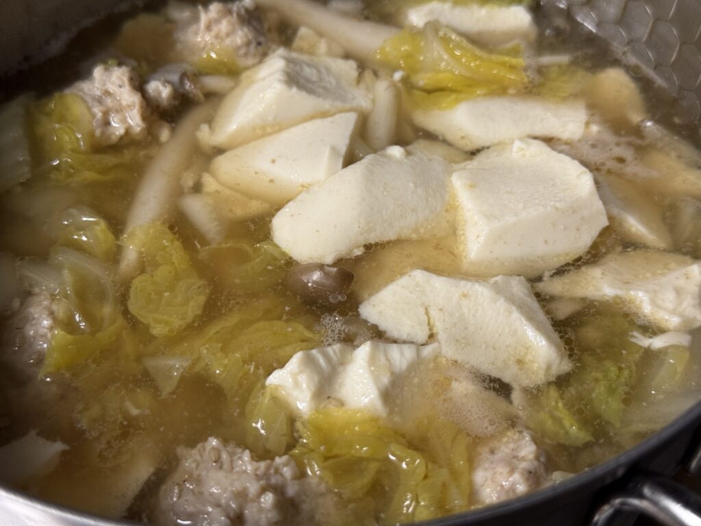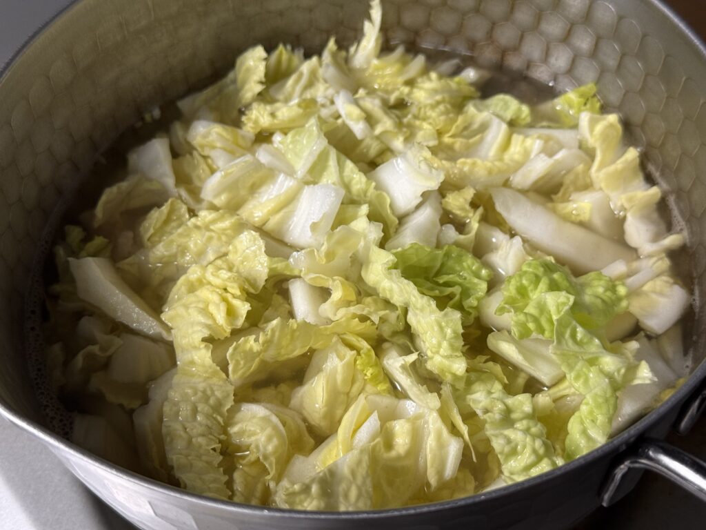 お鍋に水、和風だし、生姜を入れて沸騰させたら、白菜、しめじ、つみれを投入!白菜がとろとろになり、しめじの旨みがスープに溶け出すまで3分ほど煮込むんだよぉぉ!!