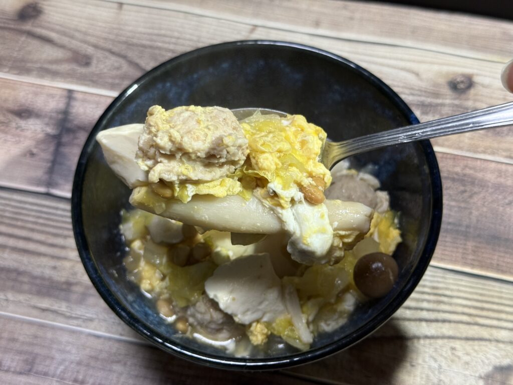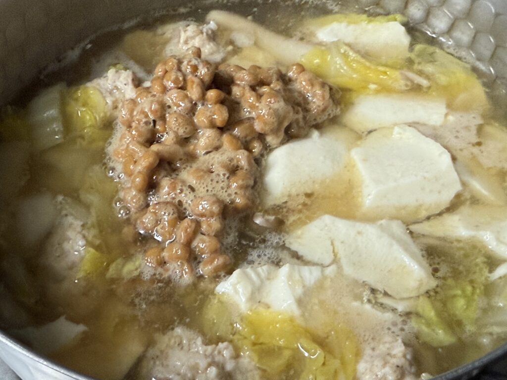 見て見てー!私の脳内シミュレーションでは、こんな感じのキラキラな『白菜とつみれのとろたま納豆スープ』が完成してたんだよぉぉ!🤤💕
