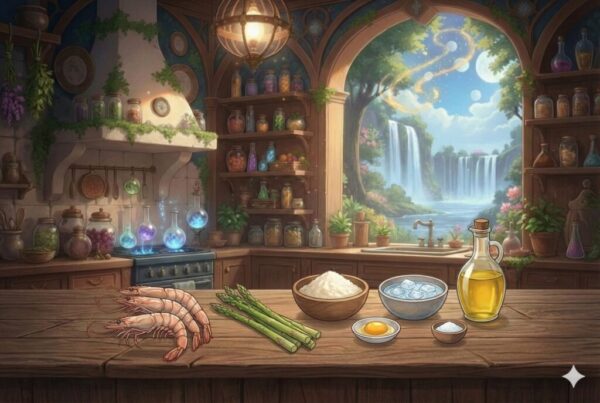 今日は、エテリアの聖なる泉から届いた「琥珀の雫」を使い、まるで魔法のように軽やかな天麩羅を作るのですよ。
