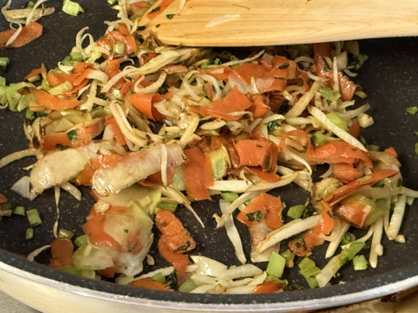 - 茎と皮をトリプルダイブ: 中火に上げ、茎と両方の皮を一気に投入。2〜3分、水分を飛ばすようにカリッとするまで炒めるのが「秘密」のポイントなんだねっ!