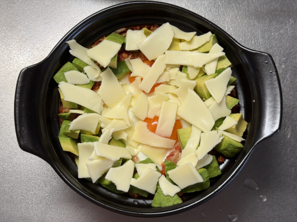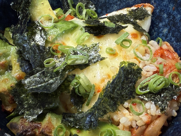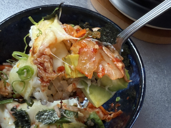 特にキムチとアボカドの上に重点的にかけると、溶けた時に具材同士を繋いでくれます。