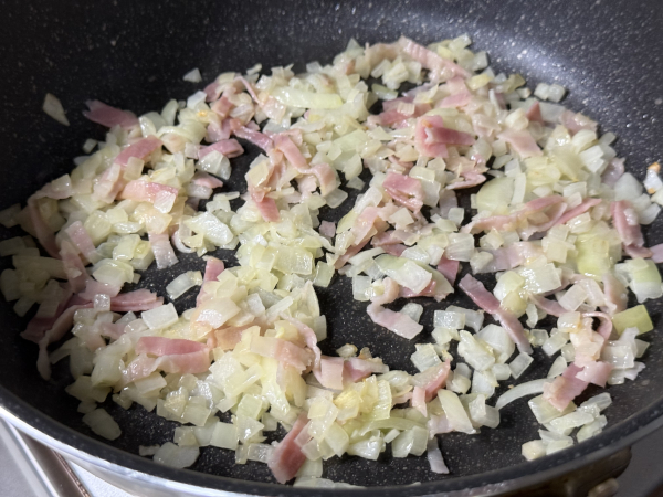 玉ねぎが透き通って、ベーコンがカリッとするまで炒めます。