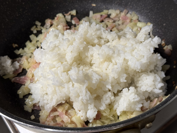 「リゾット」というと火加減や水加減が難しそうですが、これは「ご飯を炒めてチーズを混ぜるだけ」。