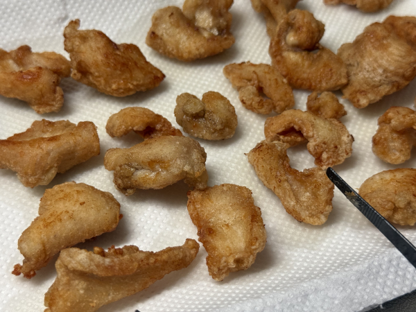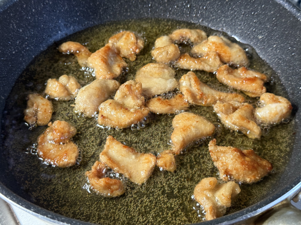 全体に片栗粉をまぶし、170℃に熱した油でカリッと揚げます。