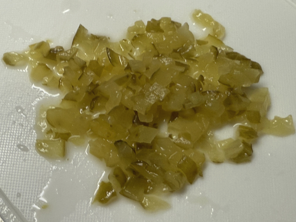 玉ねぎとピクルス(酸っぱい戦士たち)はみじん切りにして待機させておきます。