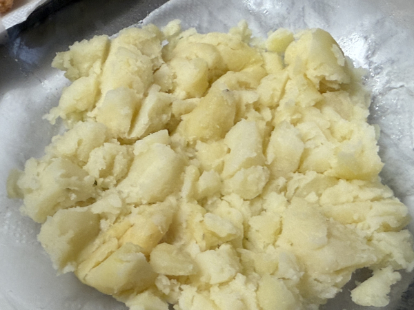 まず、じゃがいもを茹でて、熱いうちに皮をむいてボウルでつぶします。