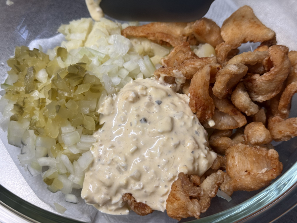 つぶしたじゃがいもに、揚げたてのチキン、刻んだ玉ねぎとピクルスを投入します。