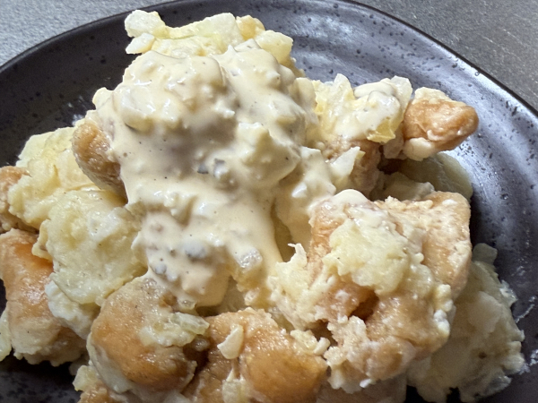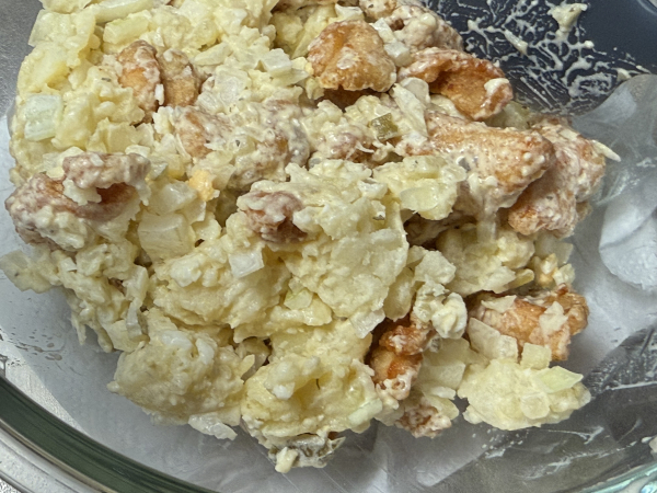 全体をぐるぐると混ぜ合わせ、ポテトとチキンをタルタルの海で溺れさせてください。