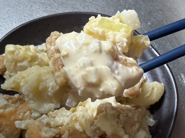ホクホクのじゃがいもに、卵のコクが詰まったタルタルソースを吸わせ、さらに唐揚げを混ぜ込むという暴挙に出ました。