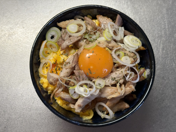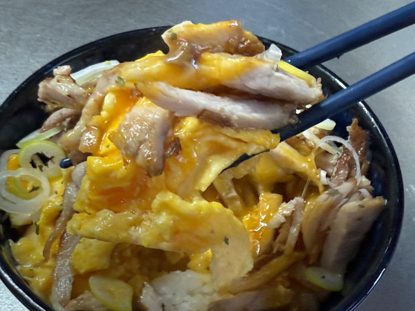 通常の親子丼のように具材を煮込むのではなく、ふわとろ卵を作ってからご飯に乗せ、さらにその上からチャーシューをふわっと“抱擁”させるのがポイントです。