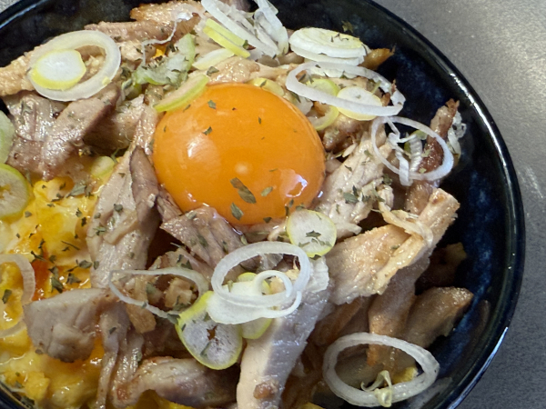 - 刻みねぎとパセリを散らせば、「チャーシューの抱擁丼・煌めき版」の完成です!