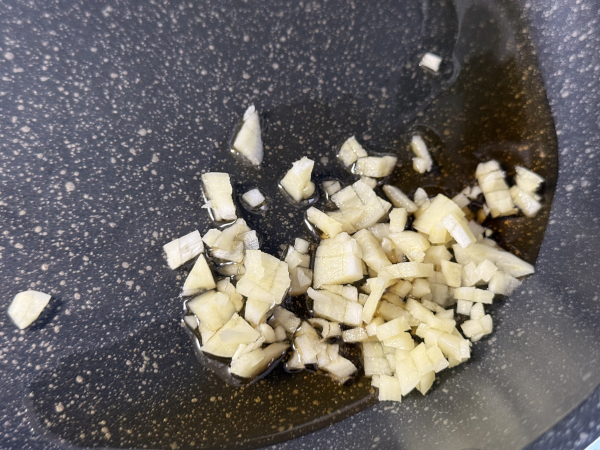 - フライパンにごま油(大さじ1)とにんにく(みじん切り)を入れ、弱めの中火にかけます。
