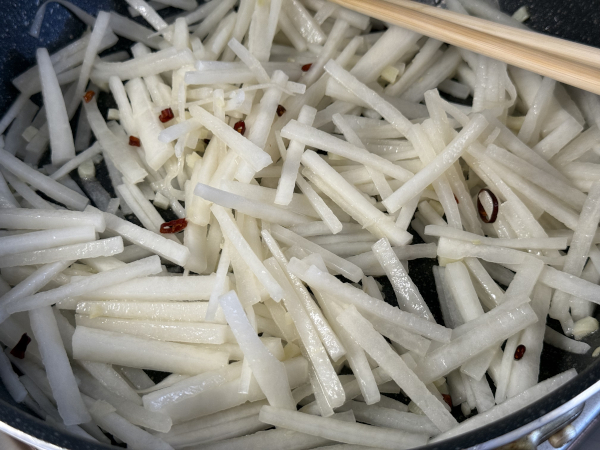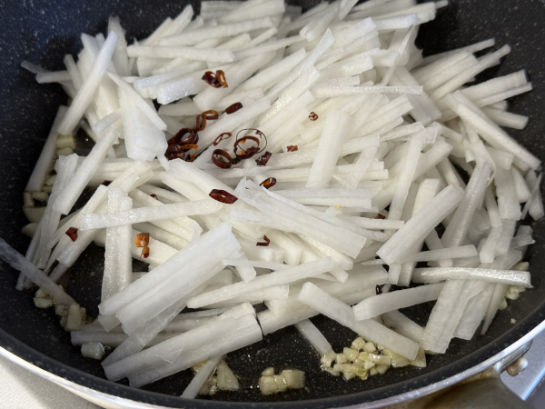 - にんにくの香りが立ってきたら、大根の細切りと輪切りの唐辛子を投入します。