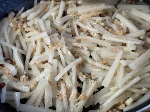 - ツナ缶を油ごとフライパンに投入し、さらに2分ほど炒め合わせます。ツナの旨味を大根に絡ませるのがポイント!