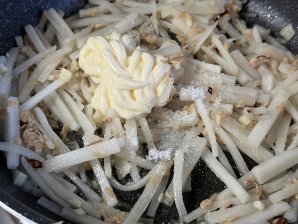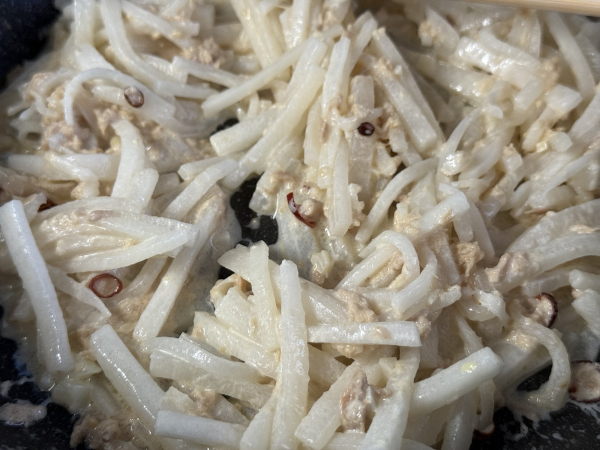 炒めているうちに大根から出た旨味の汁気と、ツナの旨味オイル、そしてマヨネーズがフライパンで一体化して、まったりと乳化してるんです。