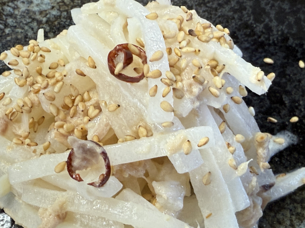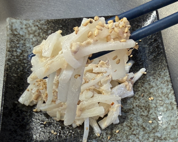 大根という安価な食材を主役に据えながらも、ツナの旨味とマヨネーズのコク、そしてごま油の香ばしさがガツンと効いて、まさにご飯泥棒な味わいです。