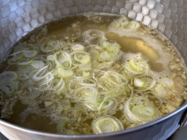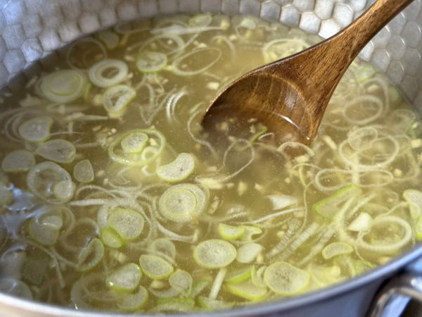- スープが沸騰したら、長ネギの薄切りを入れ、1分ほど煮て甘みを引き出します。