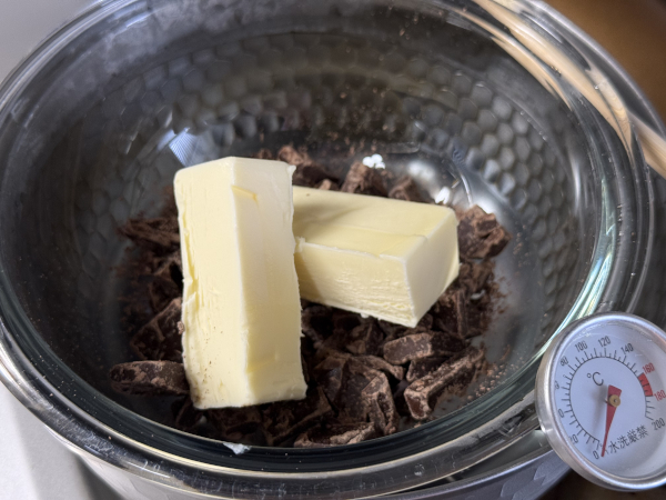 - 闇の融合: 砕いたチョコレートとバターをボウルに入れ、湯煎(55℃)で滑らかに溶かします。ここでしっかり混ぜるのが「深淵」への第一歩!
