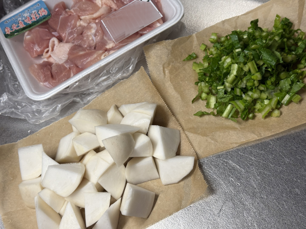 1. 鶏もも肉とカブを一口大に切ります。カブの葉は彩りに使うので、細かく刻んでおいてね!