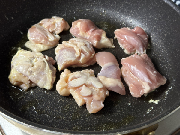 2. 鍋にバターを溶かし、鶏肉を中火で炒めます。焼き色をつけすぎないのが、白さを保つ最大の秘訣なんだよ。