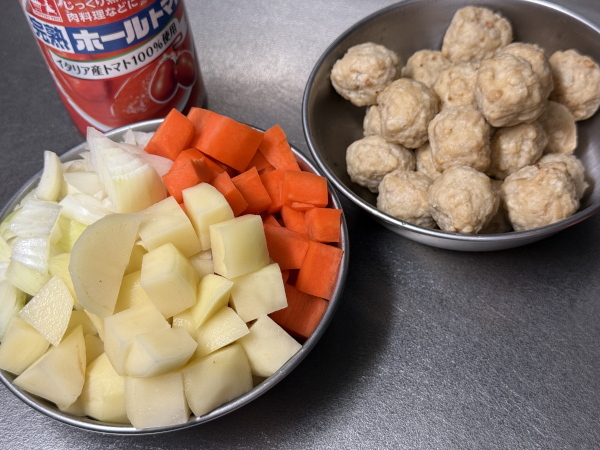 - 鍋で野菜を炒め、トマト缶と水(400ml)、コンソメを加えて煮込みます。