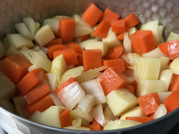 - 野菜は全て1.5cm角に。大きさを揃えることで、スープの中に「宝探し」のようなワクワク感が生まれるですよ、リョウリさん。