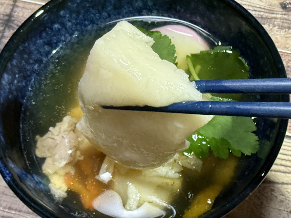ホクホクの里芋、シャキッと爽やかなミツバ、そして余熱で仕上げた鶏肉の柔らかさ……。 お餅は少し表面がひび割れちゃったけど、そのおかげで黄金だしが中までジュワッと染み込んで、噛むたびに幸せが溢れ出すんだよぉぉ!!
