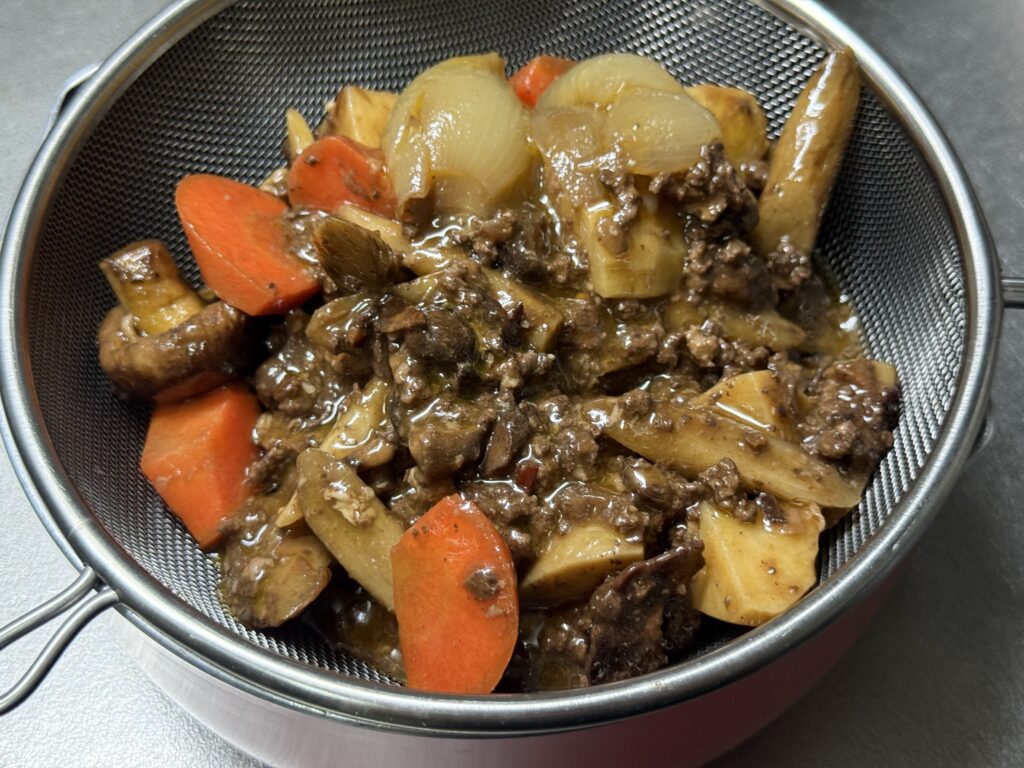 - 再加熱: 鍋に残った具材と、オイルからこし取った挽肉たちに水を加えて火にかけるんだよ。