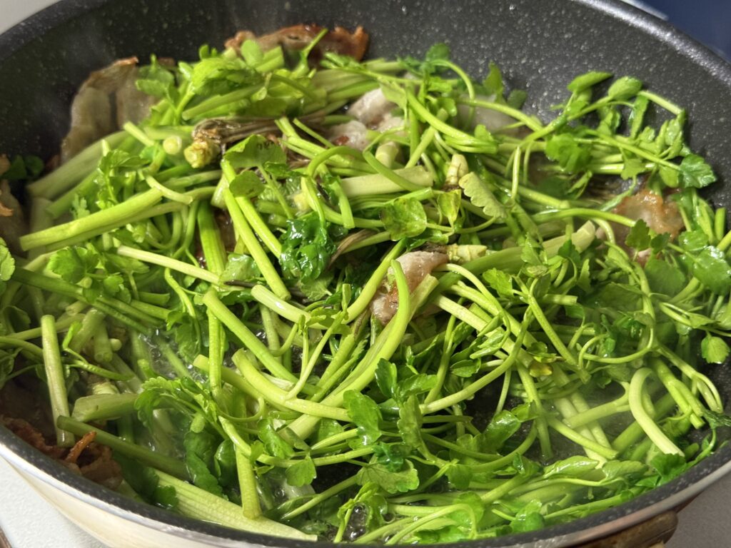 ここで秘技!まずは「セリの根」だけを先に投入するんだよぉぉ!!硬い部分に豚の脂をじっくり吸わせて、大地の香りを引き出すんだよっ。
