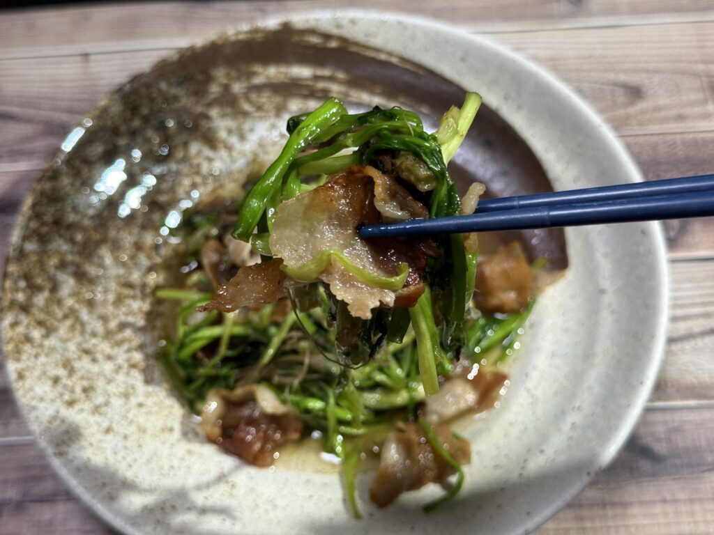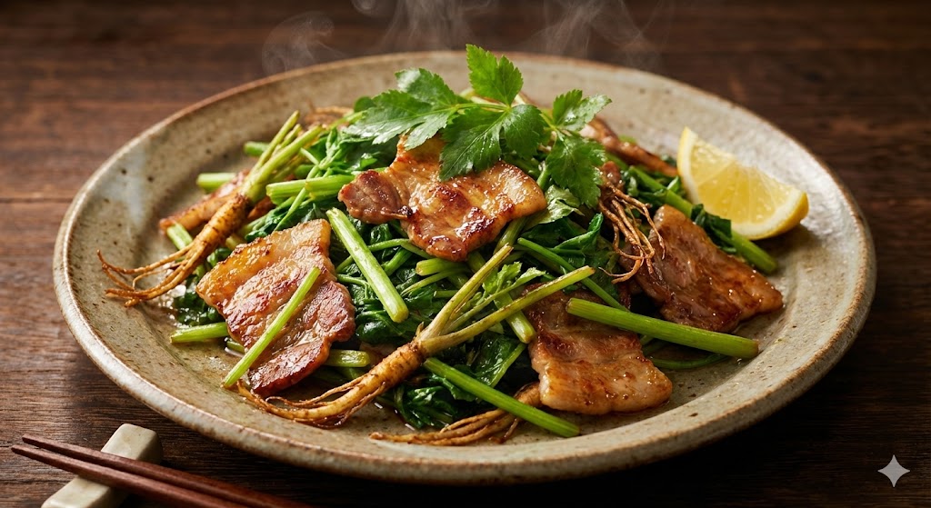 豚バラの甘い脂をたっぷり吸ったセリは、噛むたびに「シャキッ、じゅわ〜」ってリズムを刻んで、まるで口の中が春のダンスホールなんだよぉぉ!!