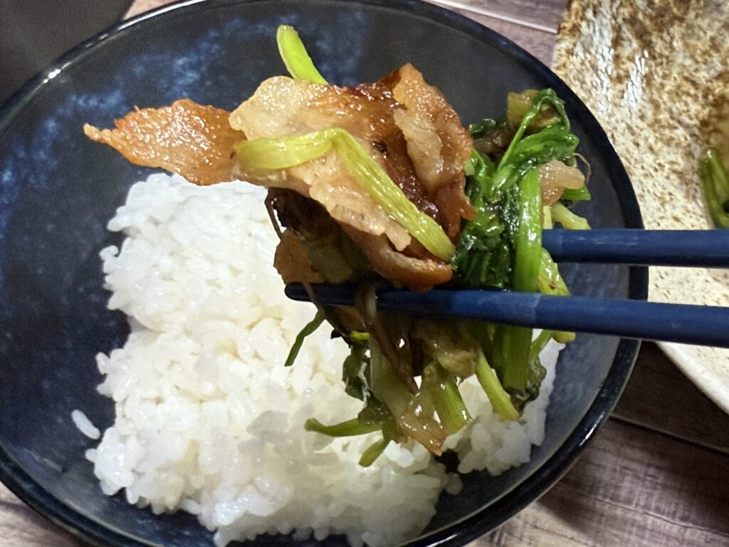 とにかく、豚バラ肉の甘い脂をじゅわ〜っと染み込ませて、仕上げに醤油を焦がす!もう、匂いだけでお隣さんの白米まで空を飛んでくるレベルなんだよぉぉ!!