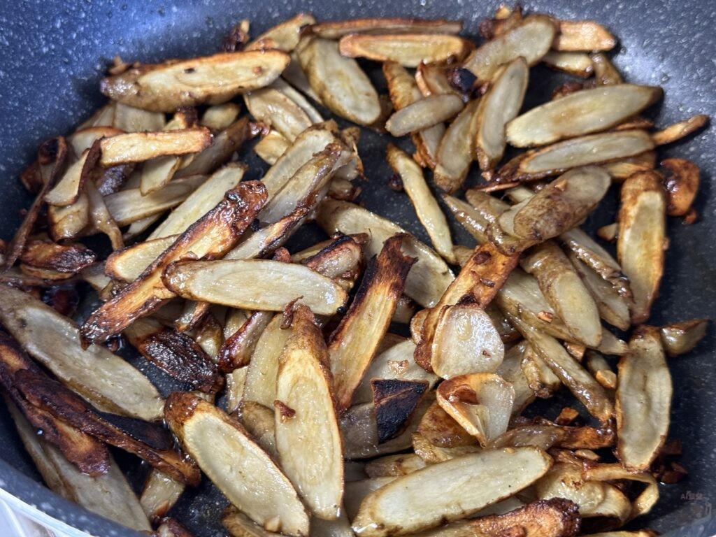 フライパンに『漆黒オイル』とにんにくスライスを熱し、ごぼうを並べるんだよ。