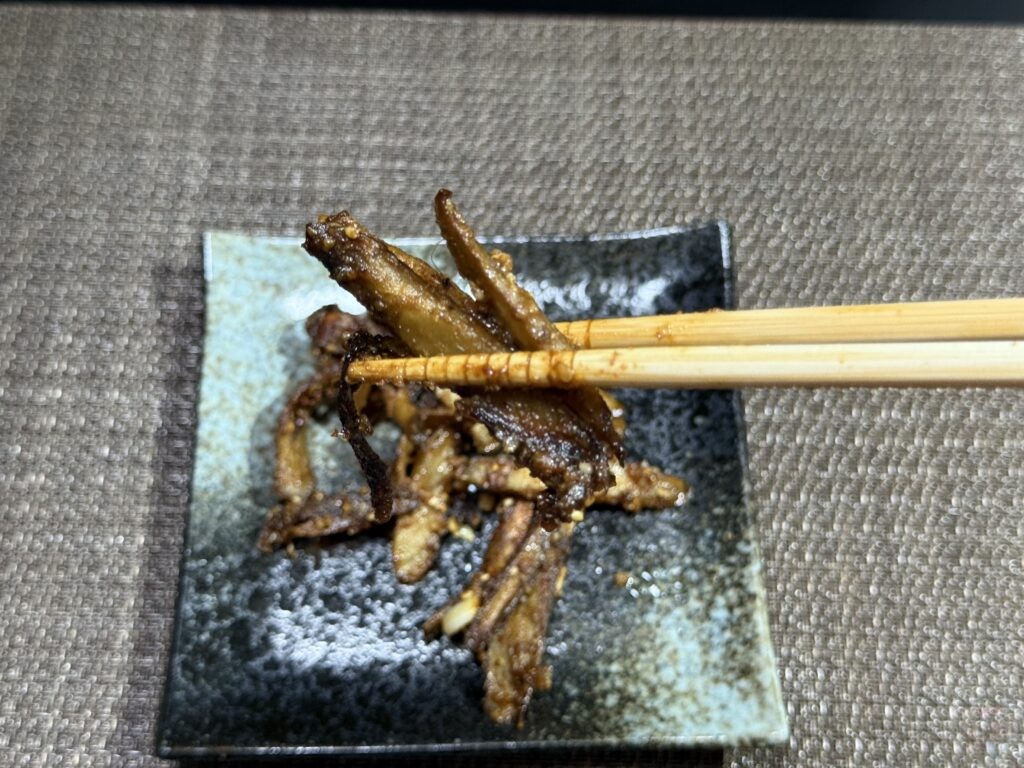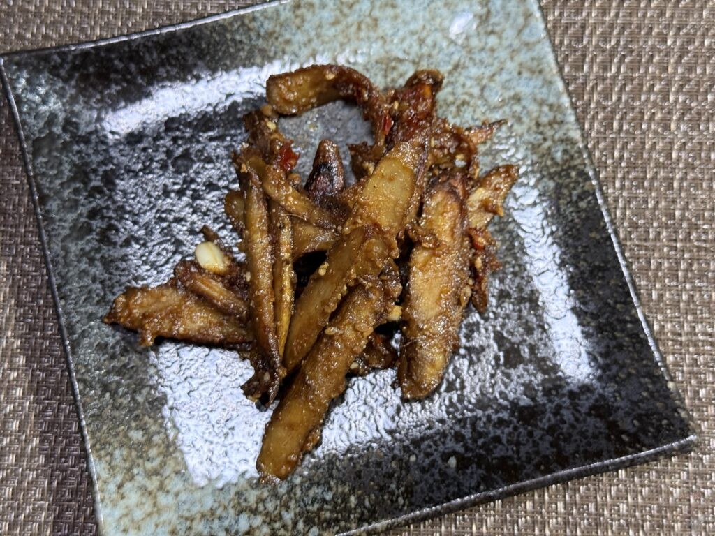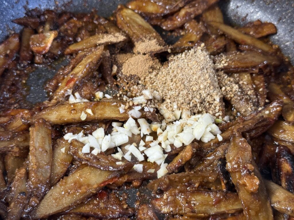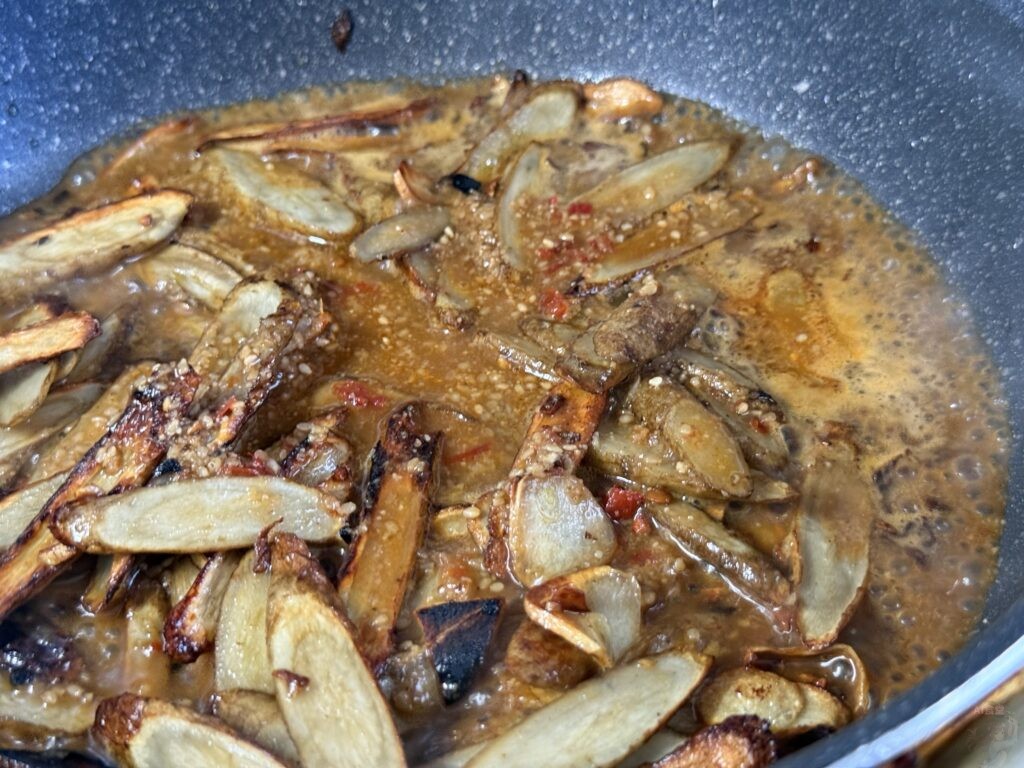 ごぼうがカリッとしたら、『担々味玉の残りタレ』(または代用タレ)を投入!