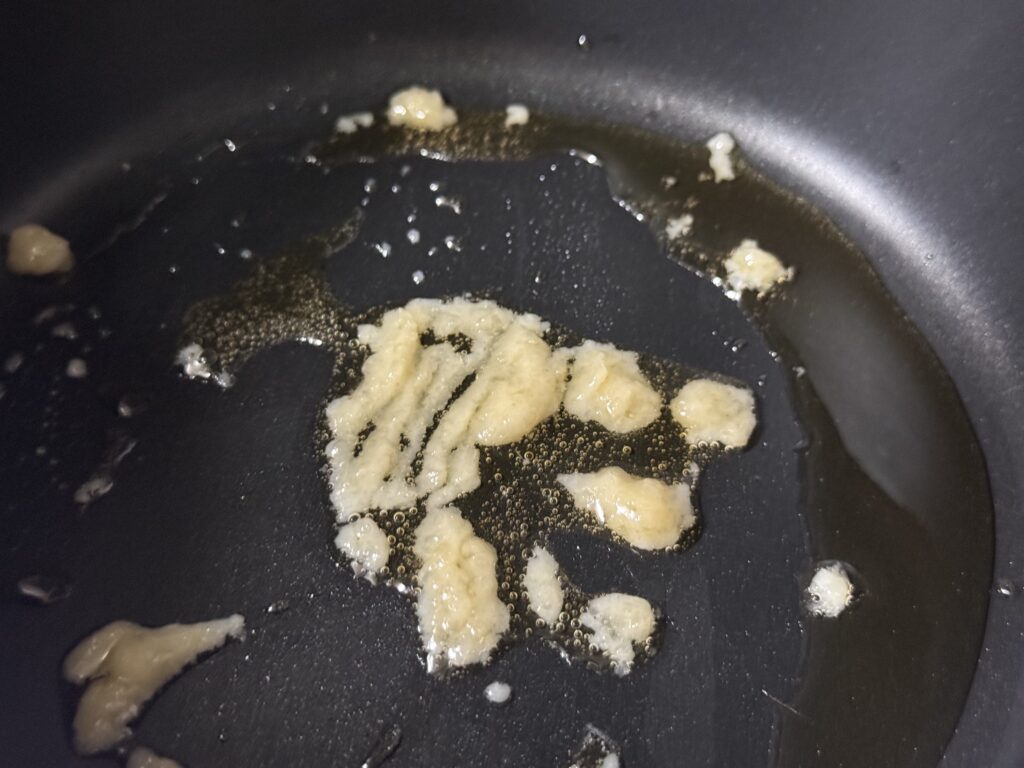 まずはフライパンにごま油と「たっぷりのニンニク」を召喚!