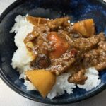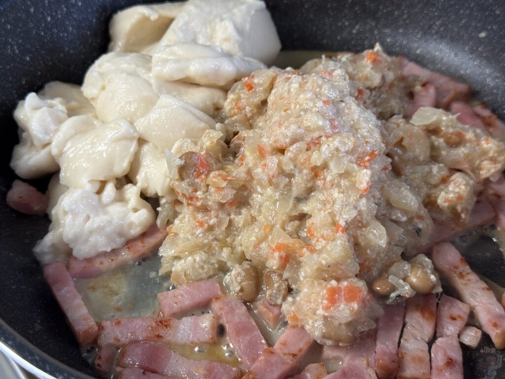 フライパンでベーコンをこんがり焼き、そこに『しもつかれ』とホワイトソースを投入!